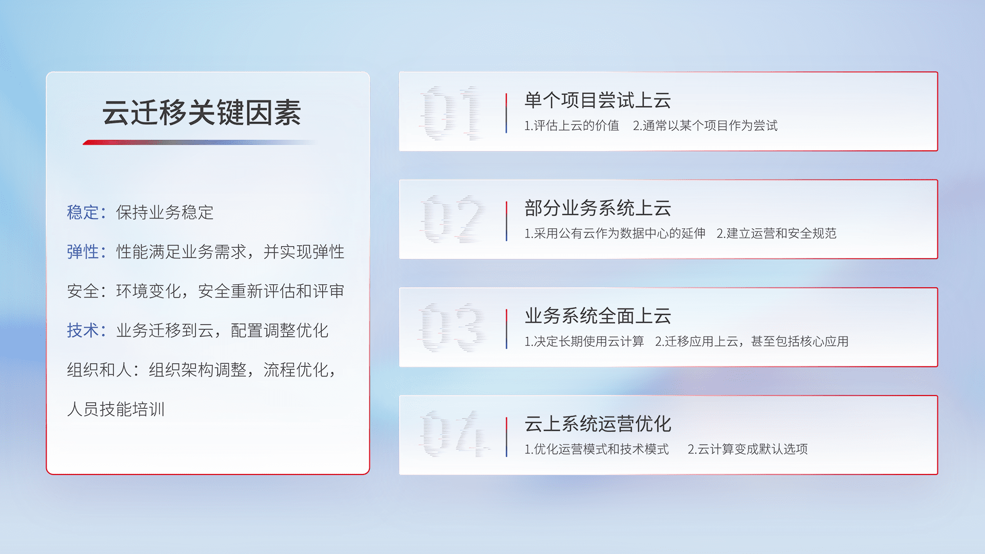 结合实际业务,,,,从规划设计、、、云平台选型、、云原生改造、、、、数据迁移、、、、集成交付,,迁移全过程为客户识别最佳上云路径,,,,做好风险识别管理,,,设计网络架构、、、身份权限、、安全审计合规、、、、操作审计、、日志审计、、监控告警策略、、、多站点容灾设计等,,,对云上基础设施进行整体规划,,,提升IT治理水平,,,以满足弹性、、、高可用、、、高性能的需求。。