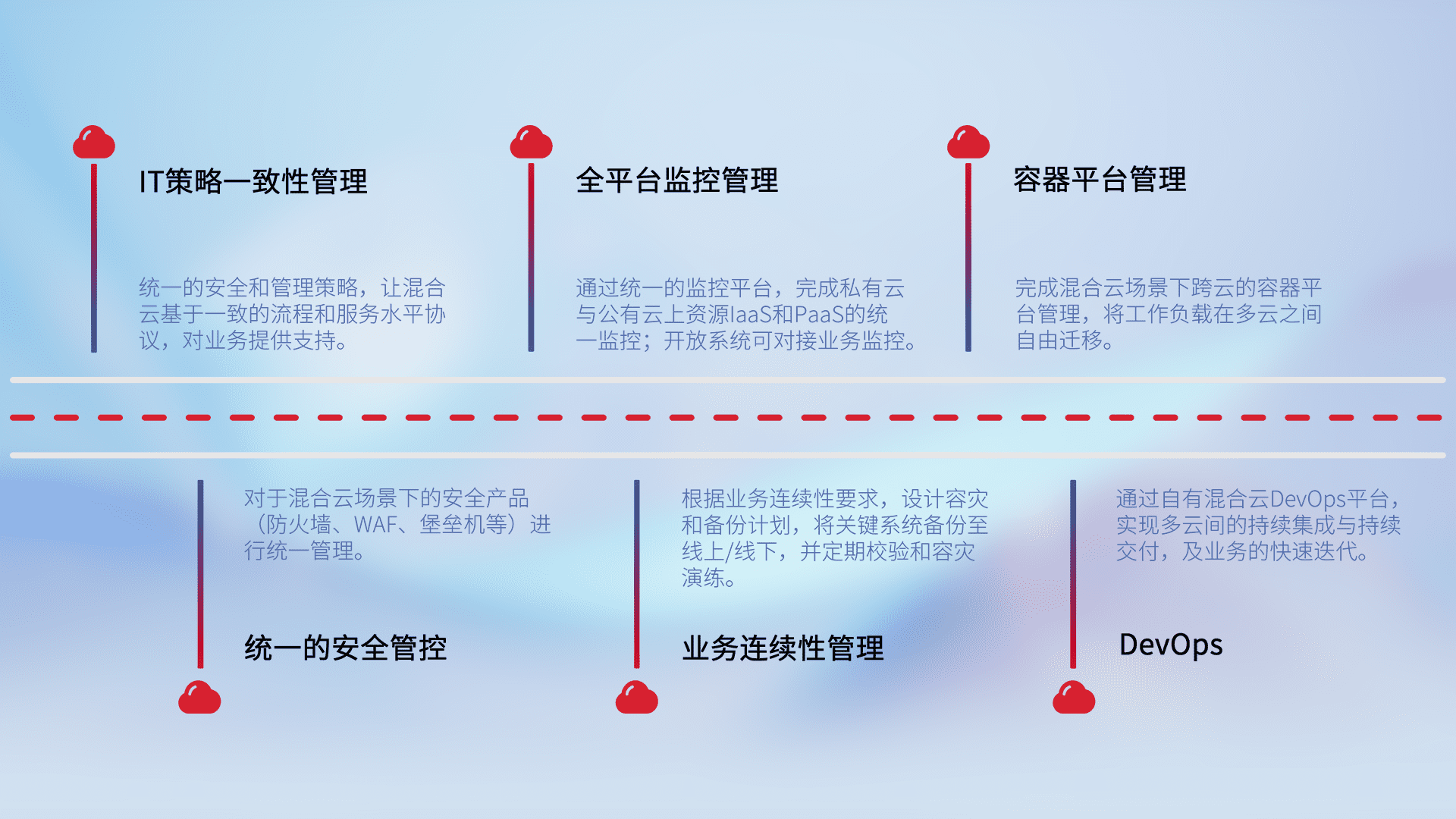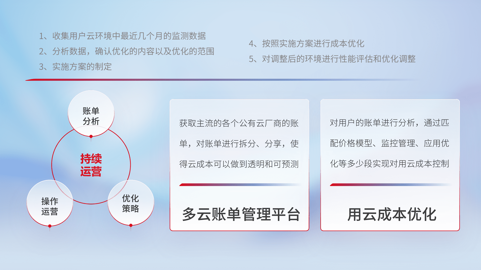 通过多云纳管,,,,以统一的资源数据模型把客户的云资源进行抽象和封装,,,,进而实现对多云资源的统一操作,,保障云资源管理的可靠性、、、稳定性与可用性。。。量身定制化运维内容,,,,配置、、、、开发运维、、、、补丁管理、、、、备份、、监控、、认证和访问管理、、审计和日常巡检等,,,保障在用云过程中的可靠度,,,,稳定度以及高可用率。。